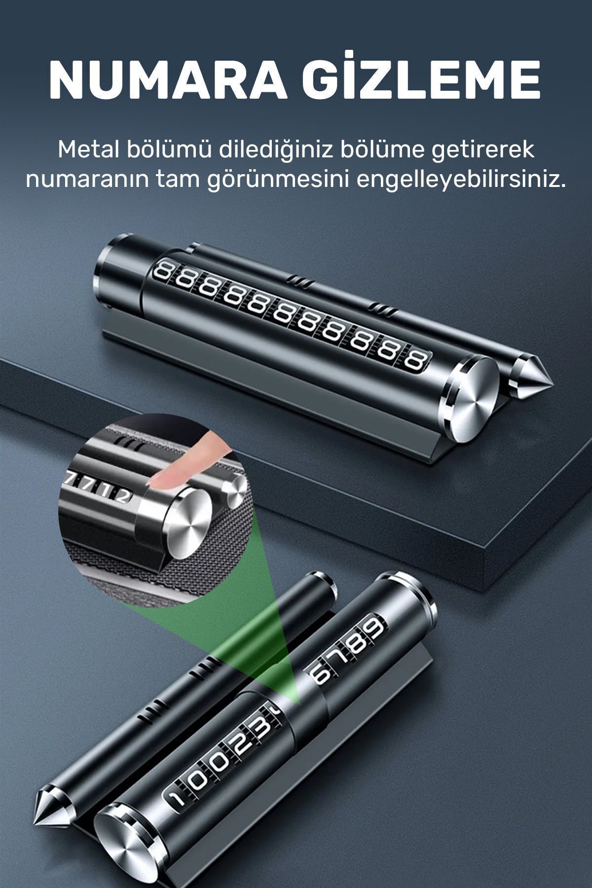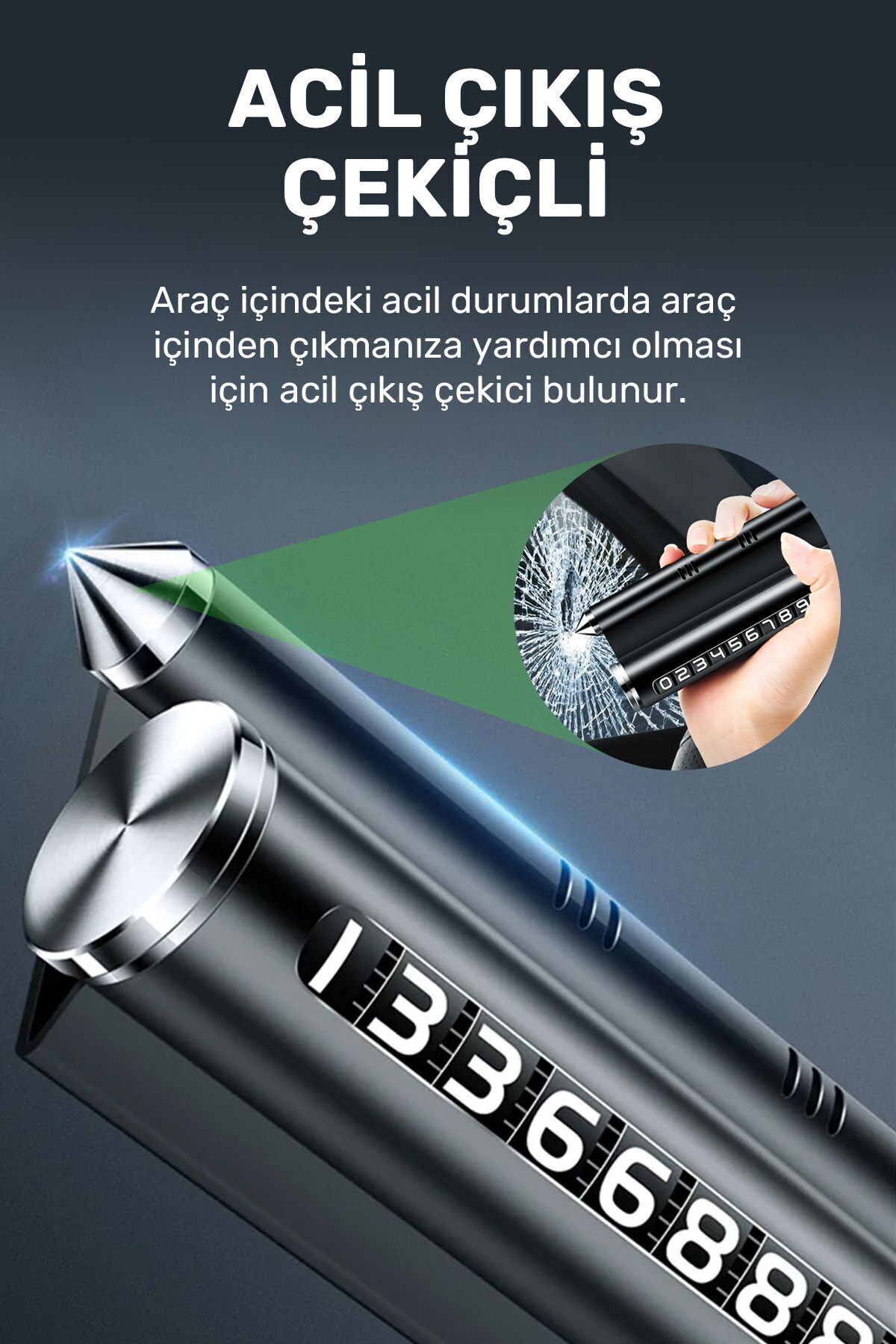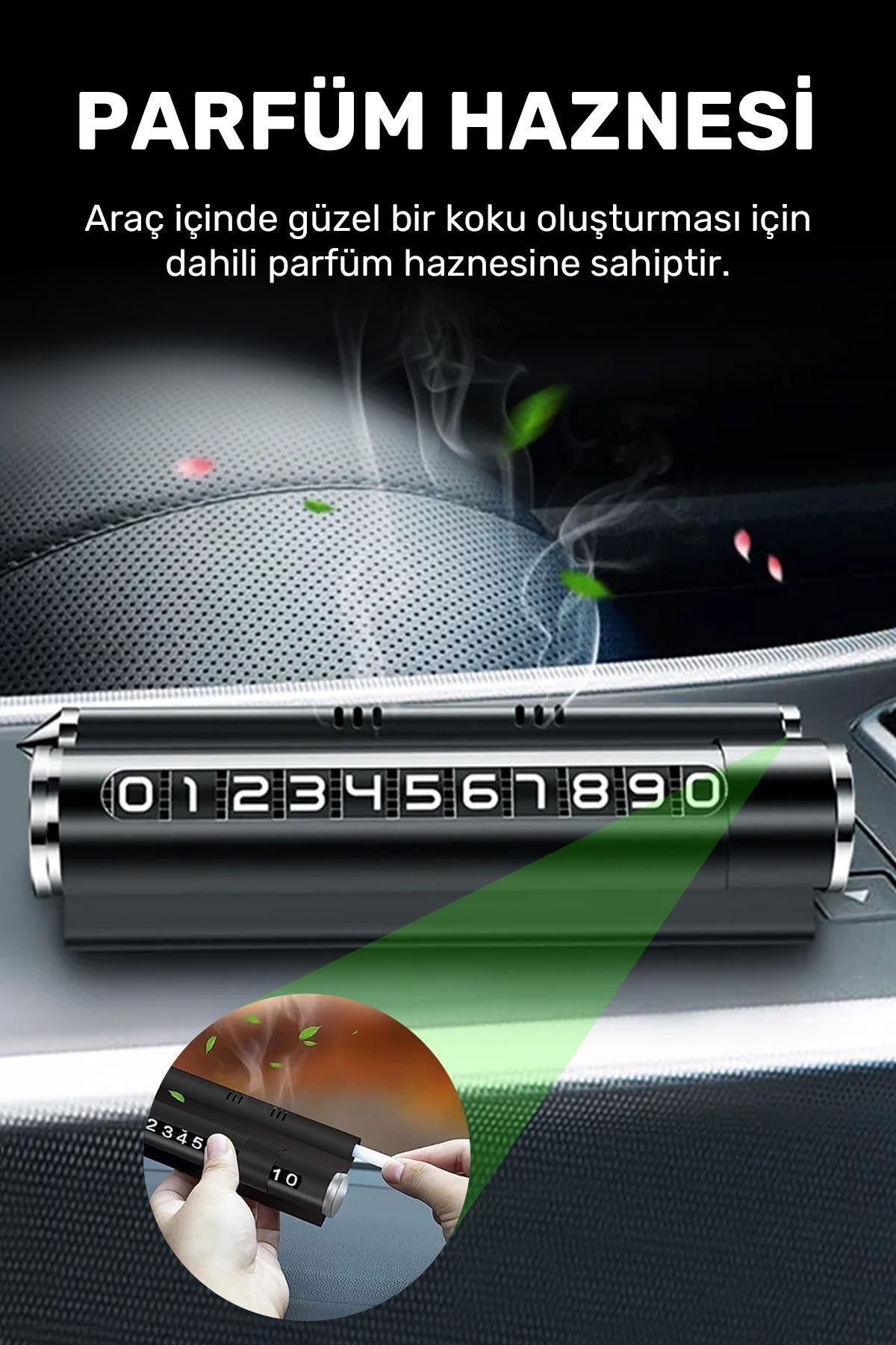 Çok Fonksiyonlu Değiştirilebilir Numaratör Parfümlü, Telefonu Tutuculu, Acil Çıkış Çekiçli (Siyah)